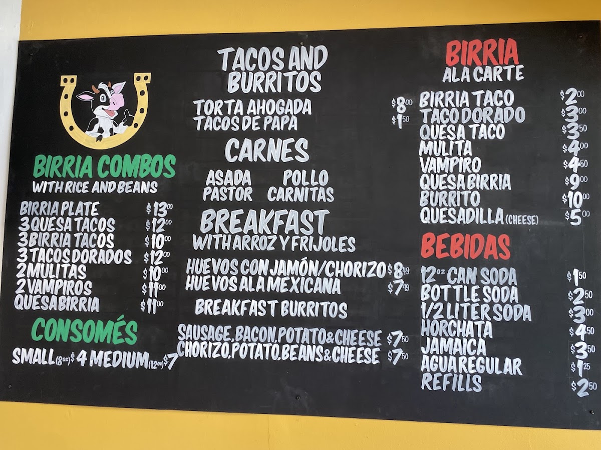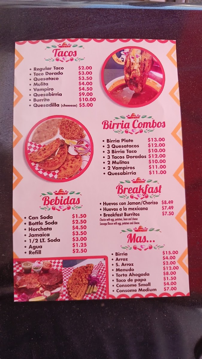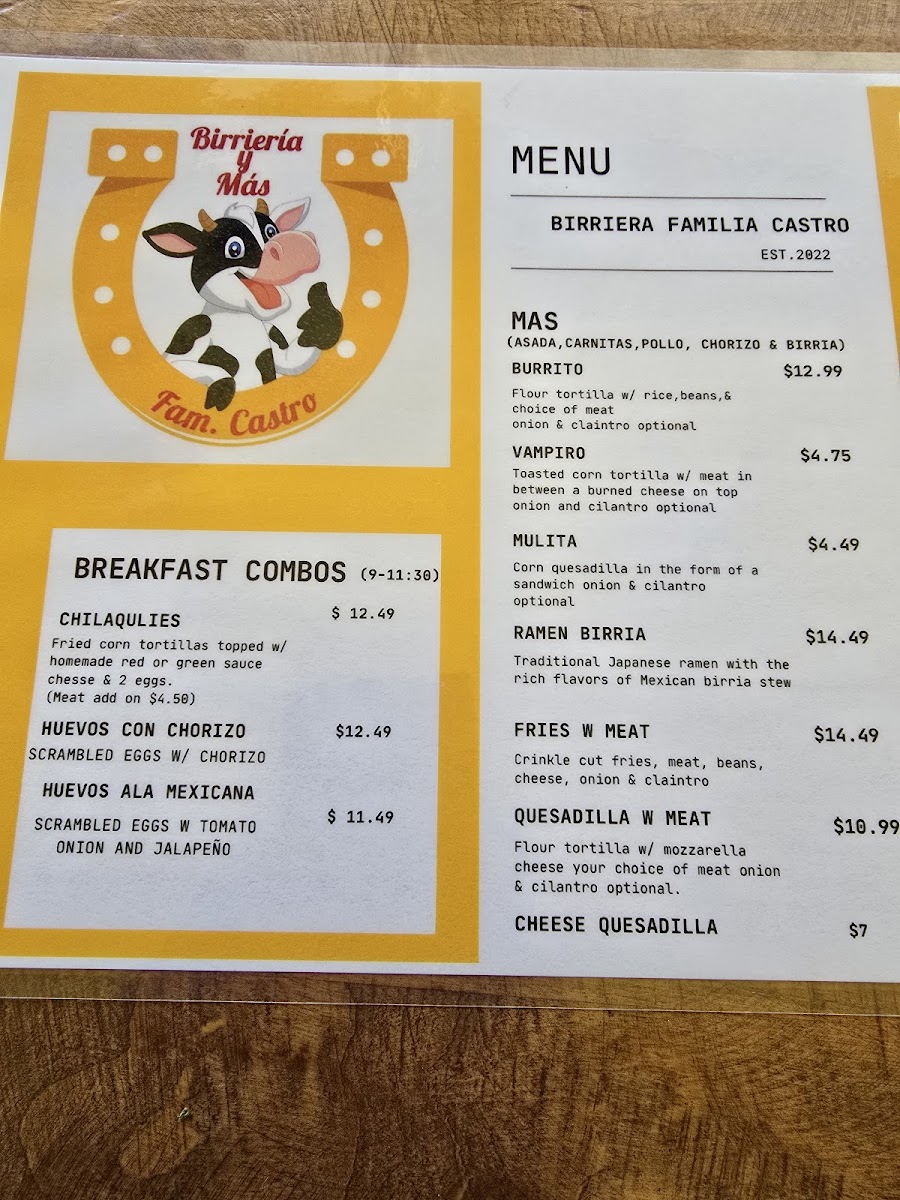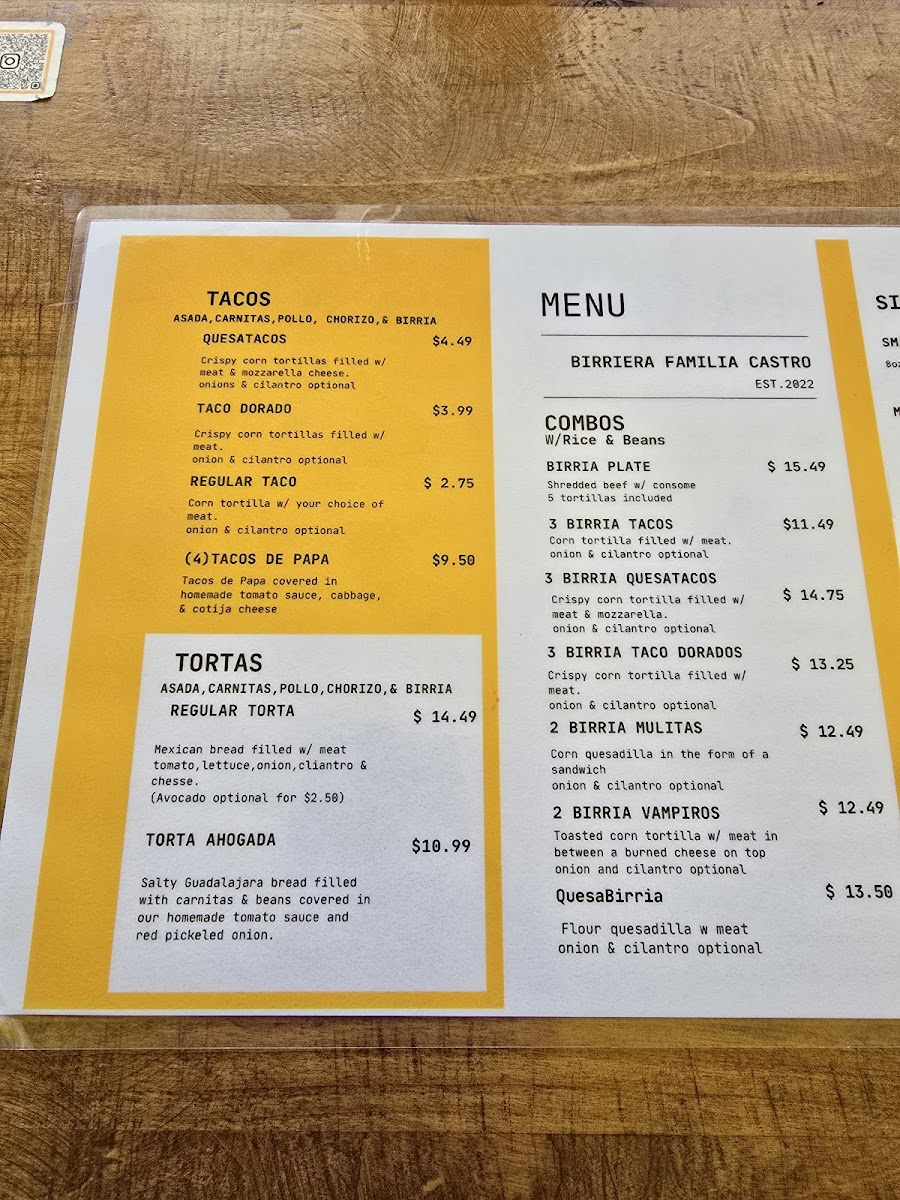 The menu at Birrieria Familia Castro features a variety of traditional Mexican dishes with a focus on birria specialties. It is organized into distinct groups to guide visitors through their options.